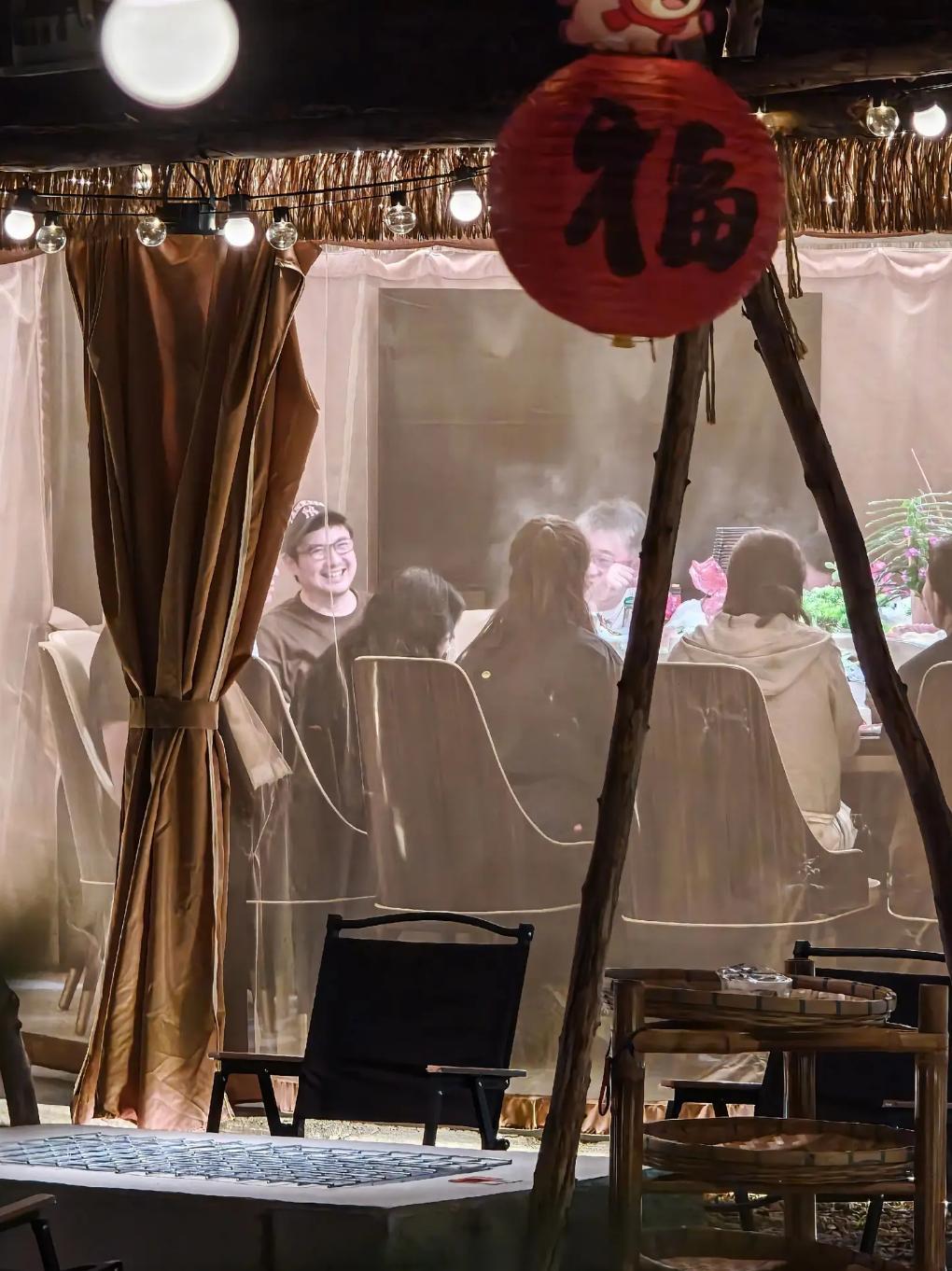 虽然是难得的团聚,但沈腾没选择高档餐厅,只是吃了一顿火锅,坐在透明的塑料棚大快朵颐。